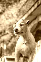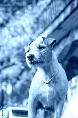 Pure breed Jack Russell Terrier dog with broken hair posing on a rock outdoors.