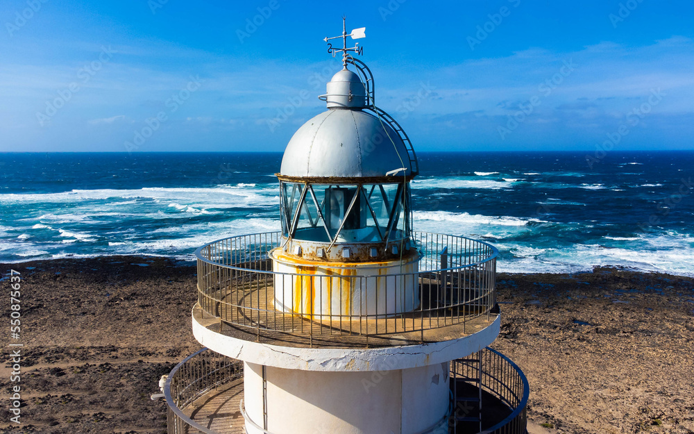 Aerial view of the lighthouse of El Toston on the north coast of Fuerteventura in the Canary Islands, Spain - Red and white striped lantern tower facing the Atlantic Ocean
