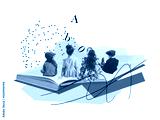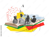 Contemporary art collage. Little kids, children sitting on open books, learning how to read. School time. Homework study