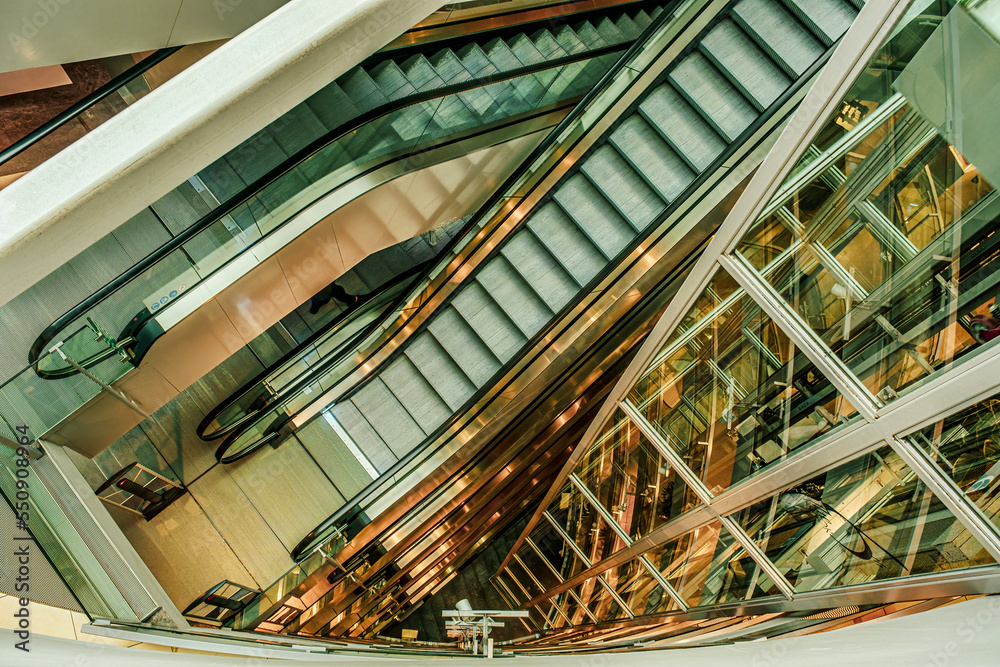 empty escalators and glass elevator, top down view