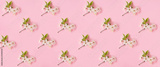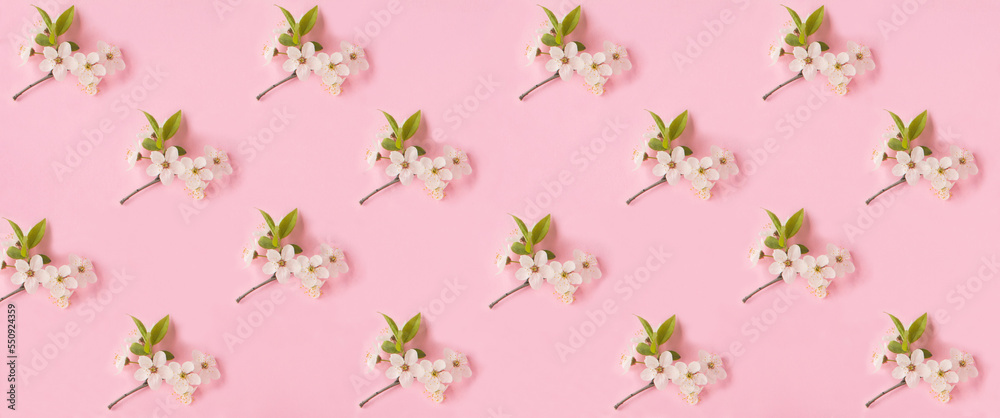 White flowering tree branches on the pink background. Pattern. Flat lay.