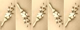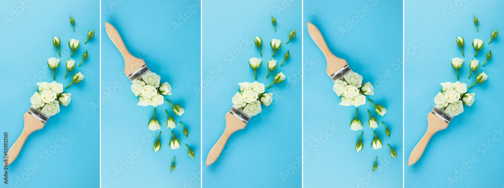 Collage. Paintbrush with white roses on the blue background. Flat lay. Pattern.
