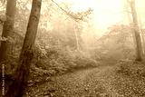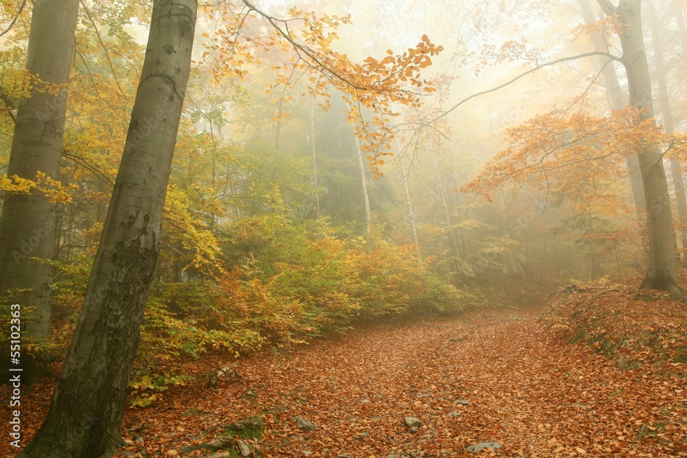 Path through autumn forest on a foggy October day