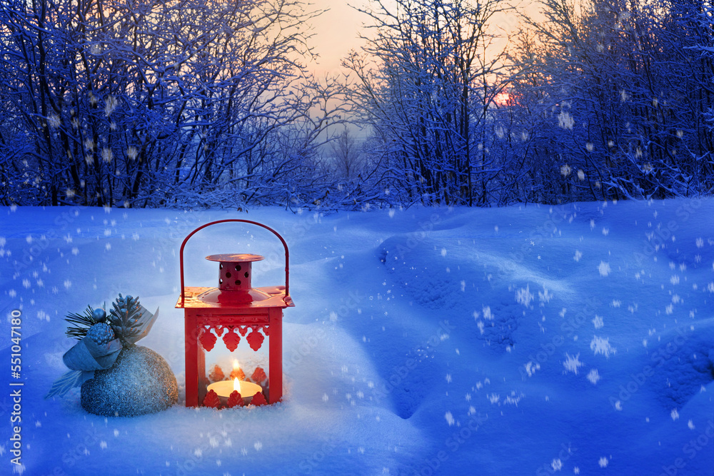 winter lantern in the snow, Christmas card with glowing lantern