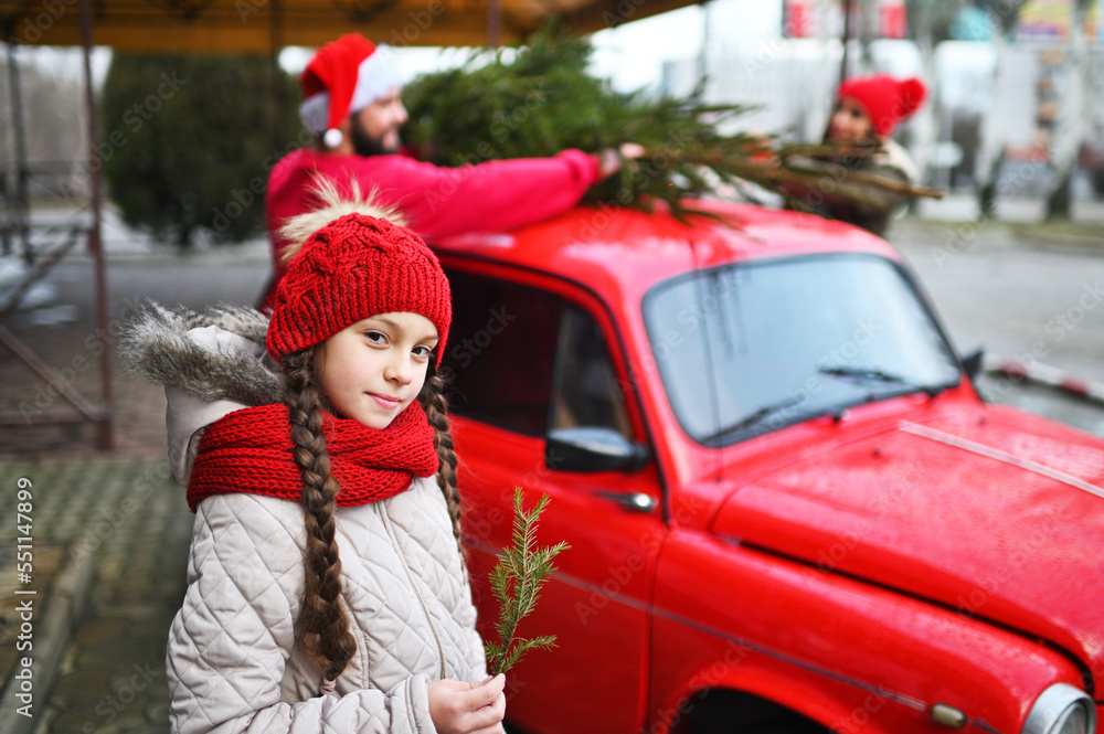 little girl with pigtails holds a branch of a Christmas tree in her hands against the background of parents who tie a Christmas tree to the roof of a red retro car.