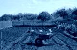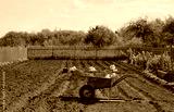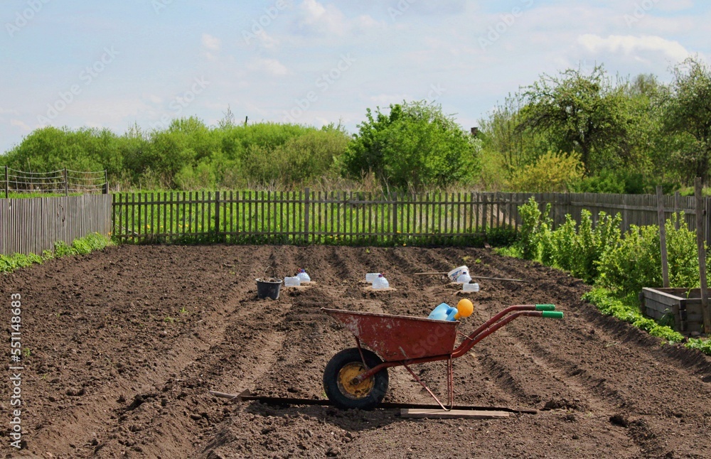 Trolley in a vegetable garden on plowed land in the spring