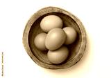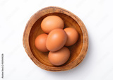 Brown fresh raw eggs in wooden bowl plate on white background.