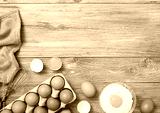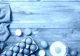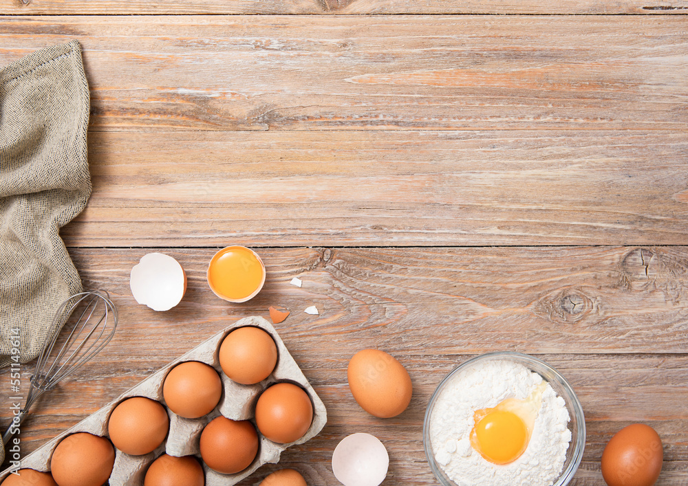 White tray with raw eggs and flour with yolk and kitchen towel on wooden table.