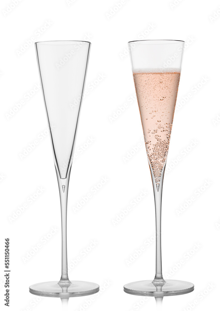 Elegant luxury glass with pink rose champagne with bubbles on white. Fine empty and full glass for fine dinner.