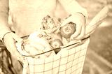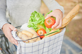 Close up of a bicycle basket full with lettuce, bread, potatoes and tomatoes. Young woman puts a tomato in the basket. Healthy vegan lifestyle concept.
