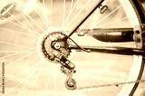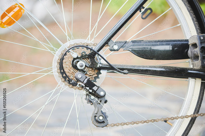 Detail of the rear wheel of a classic bike with gears. Bicycle chain and gears close up.