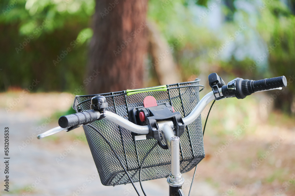 Detail of the basket, bell and handle bar of an utility bike. Bicycle parts close up.