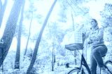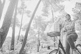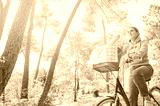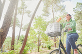 Young woman rides her classic bicycle carrying in the basket fresh vegan food from the grocery. Healthy lifestyle concept. Utility bike.