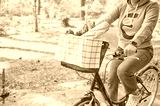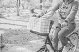 Unrecognizable young woman rides her European bike carrying fresh food in the basket. Healthy vegan lifestyle concept.