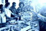 Friends, happy with pizza at restaurant, fast food and soda with group on lunch or dinner date, happiness and nutrition. Food, friendship and meal at New York pizzeria, party and social gathering.