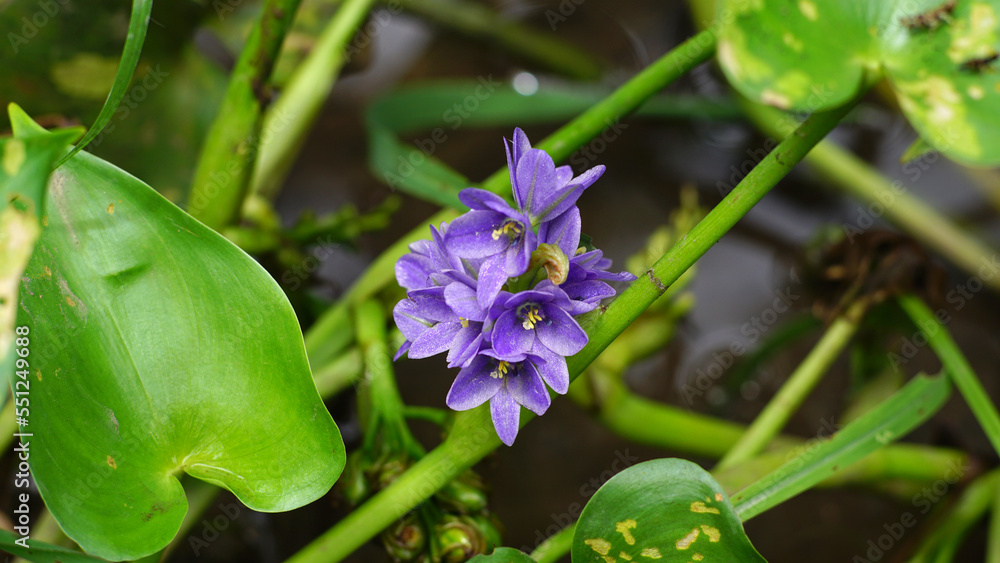The Monochoria vaginalis plant has purple flowers that are blooming with clusters on green leaf stalks.