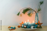 Four blue turquoise candles for Advent, Christmas decoration, wooden stars on a plate and a vase with pine branches, copy space, selected focus, narrow depth of field