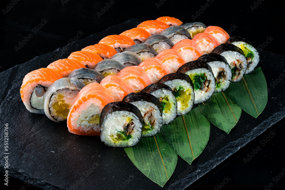 Set of japanese sushi rolls with tuna, salmon, cream cheese, rice paper, shrimp, avocado, seaweed, sweet pepper.