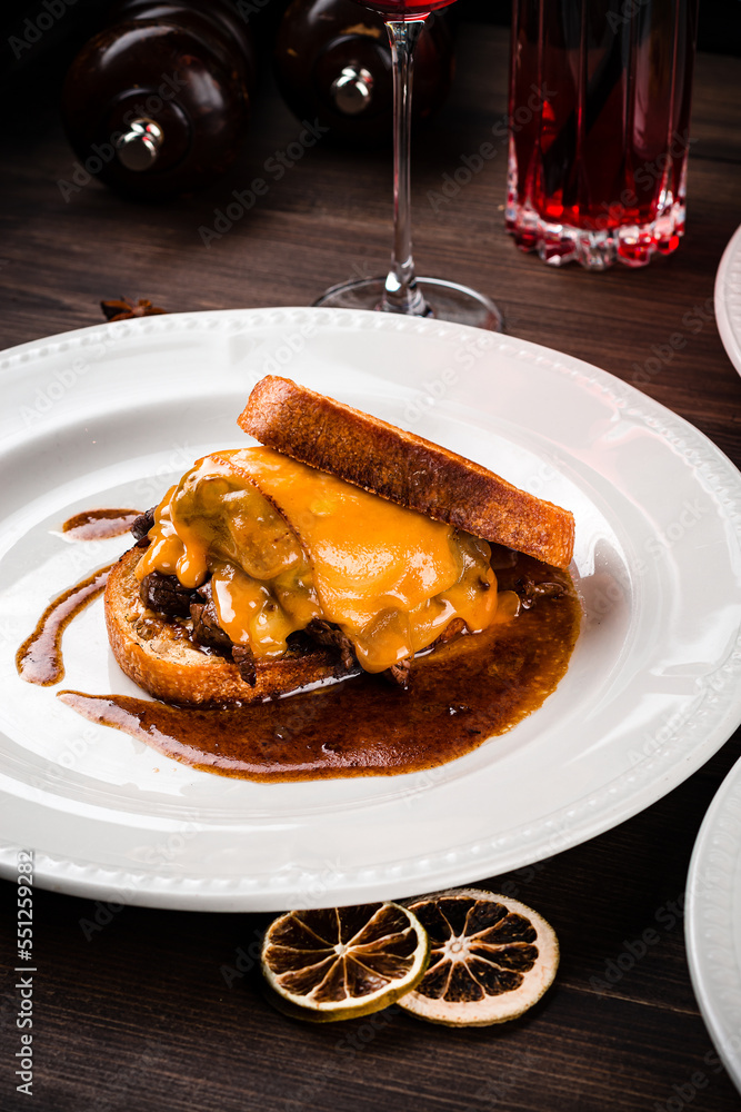 Restaurant food beef burger with Cheddar cheese with barbecue sauce.