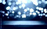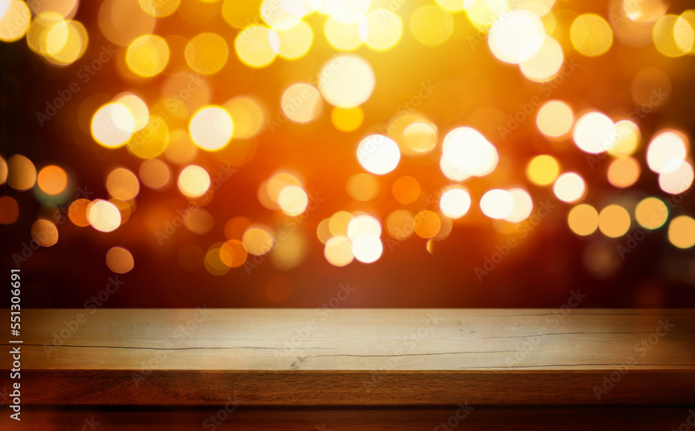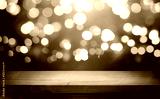 Christmas Bokeh Background - rustic wooden table and Magic golden blurred holidays lights - Backdrop for product presentation