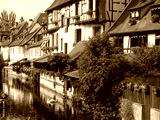 Beautiful view of river, old town and white swan on a summer day. Kolmar. France.