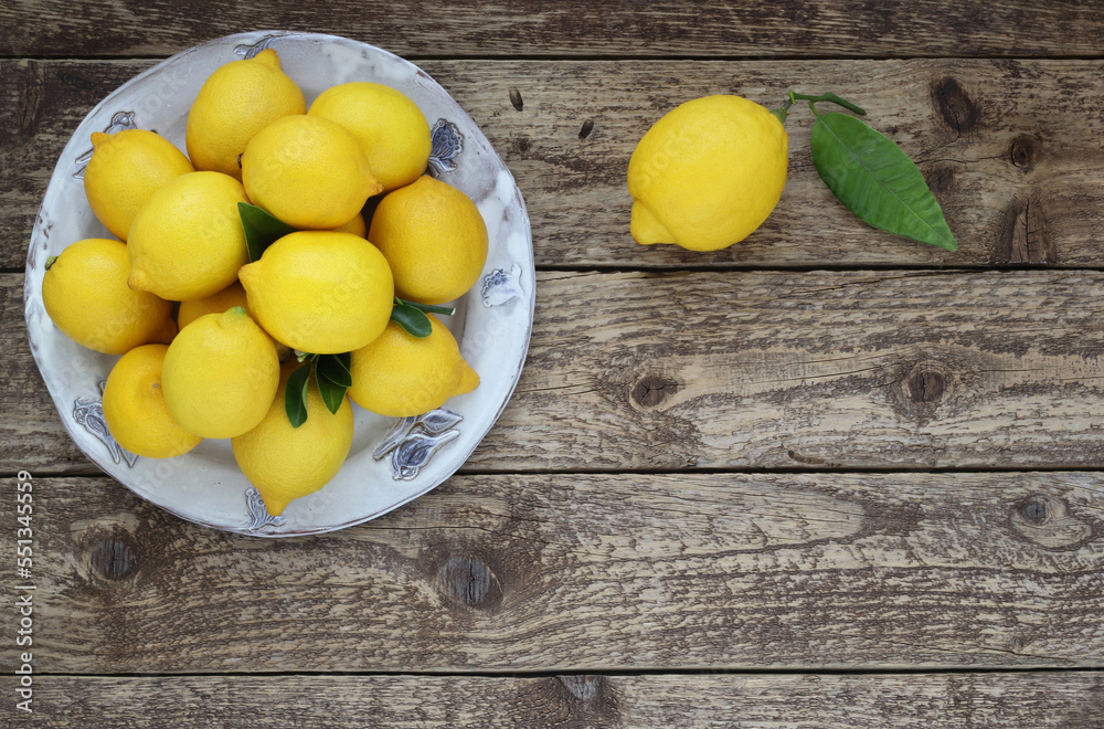 Fresh lemons fruit on plate on wooden table. Top view. Decorative arrangement of lemons with leaves on wood background.