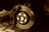 Front assembly of ventilated disc brake and wheel hub on an used car, view with removed wheel.