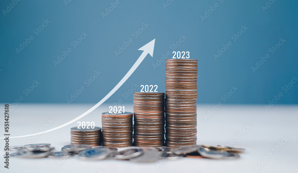 Close up of rows of coins for planning concept 2022-2023 finance and banking invest money coins Growing Savings With Coins In Popularity