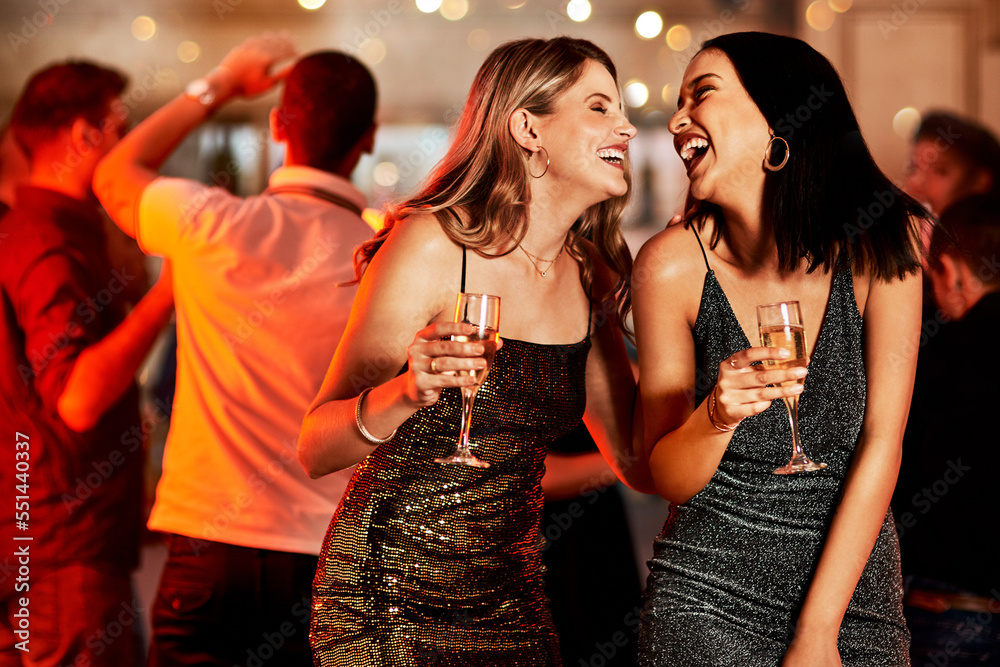 Women, laughing or bonding in champagne night party, clubbing event or birthday celebration in New York. Smile, happy people or friends with alcohol glasses on luxury restaurant or disco dance floor