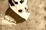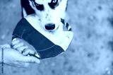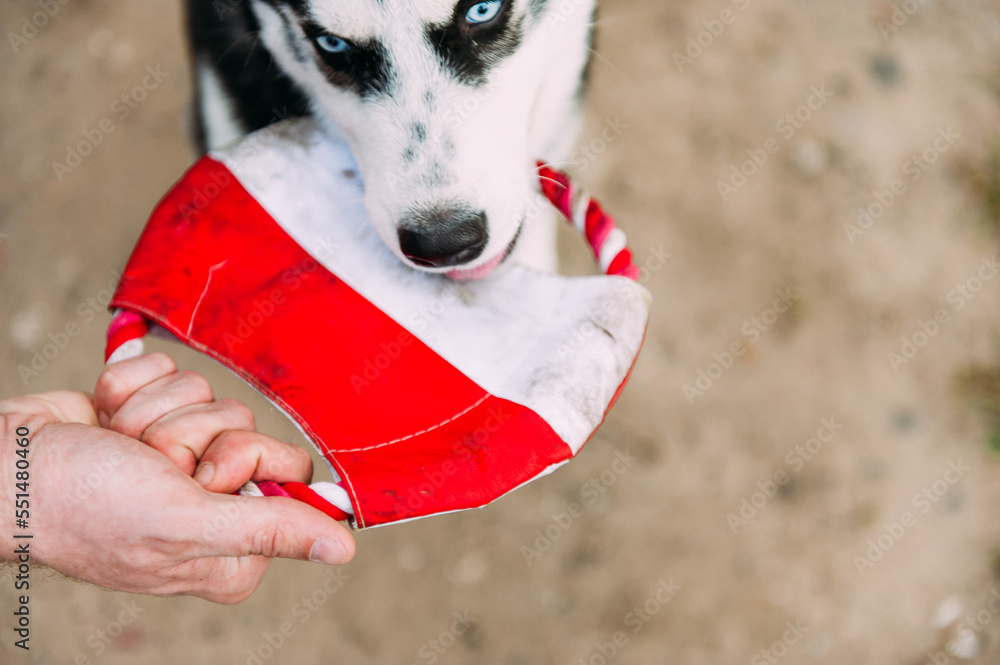 Cute siberian husky puppy dog play with toy outdoors at sunny summer weather