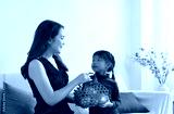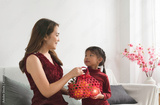 Young beautiful lady recieve orange basket from little girl ,with smiling face