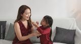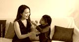 Young beautiful lady and little girl eating orange fruit ,doing activity together,with happy feeling,