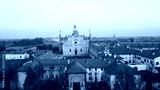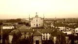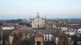 Europe, Italy , Pavia 2022 - Certosa di Pavia is a religious monastery of Carthusian friars near Milan - founded by Visconti family - drone aerial view
