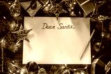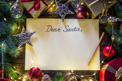Empty Santa paper letter and christmas decoration around it. Christmas or New Year holiday background.