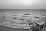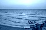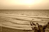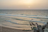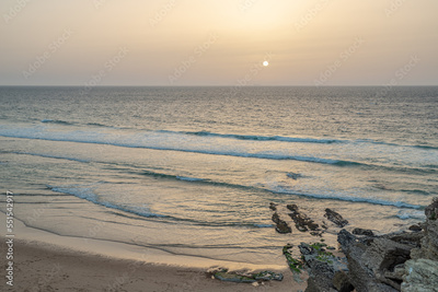 Beautiful sunset at the sandy shore in of the calm Atlantic ocean. Long foamy waves approaching sandy beach.