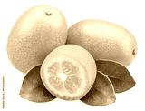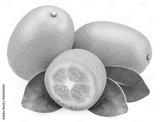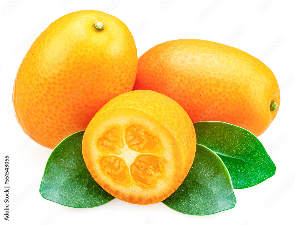 Kumquat fruit and cross cut of kumquat with leaves isolated on white background.