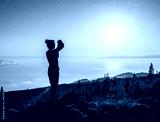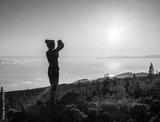 Silhouette of woman with camera. Woman takes photo of La Gomera Island in the rays of the setting sun. Tenerife Island.