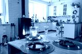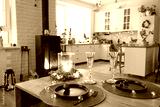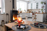 Festive interior of house is decorated for Christmas and New Year in loft style with black stove, fireplace, Christmas tree. Warm studio room with set table, burning wood, cozy and heating of home