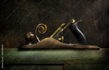 Old plane resting on old door with curl of wood shaving.