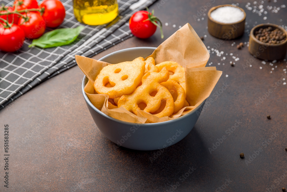 potato smiles on bowl on dark brown table