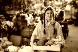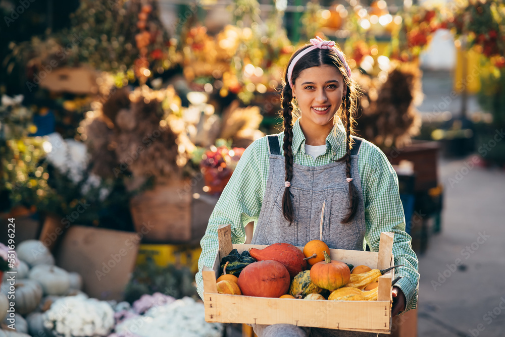 Farmer woman holds a wooden box with pumpkins in hands