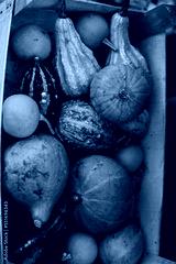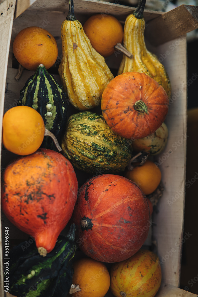 A variety of pumpkins in a wooden box, top view