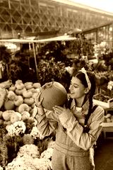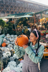 Happy farmer woman in a denim jumpsuit holds ripe pumpkin