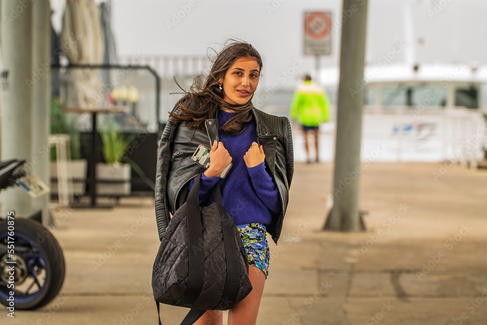 young latin hispanic girl with leather jacket in the street