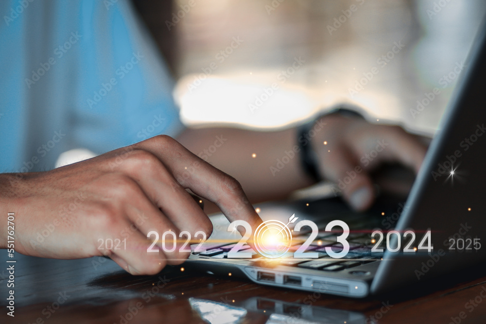Trend of 2023. people business investor using laptop with virtual 2023 year diagram, business trend, change from 2022 to 2023, strategy, investment, business planning and happy new year concept