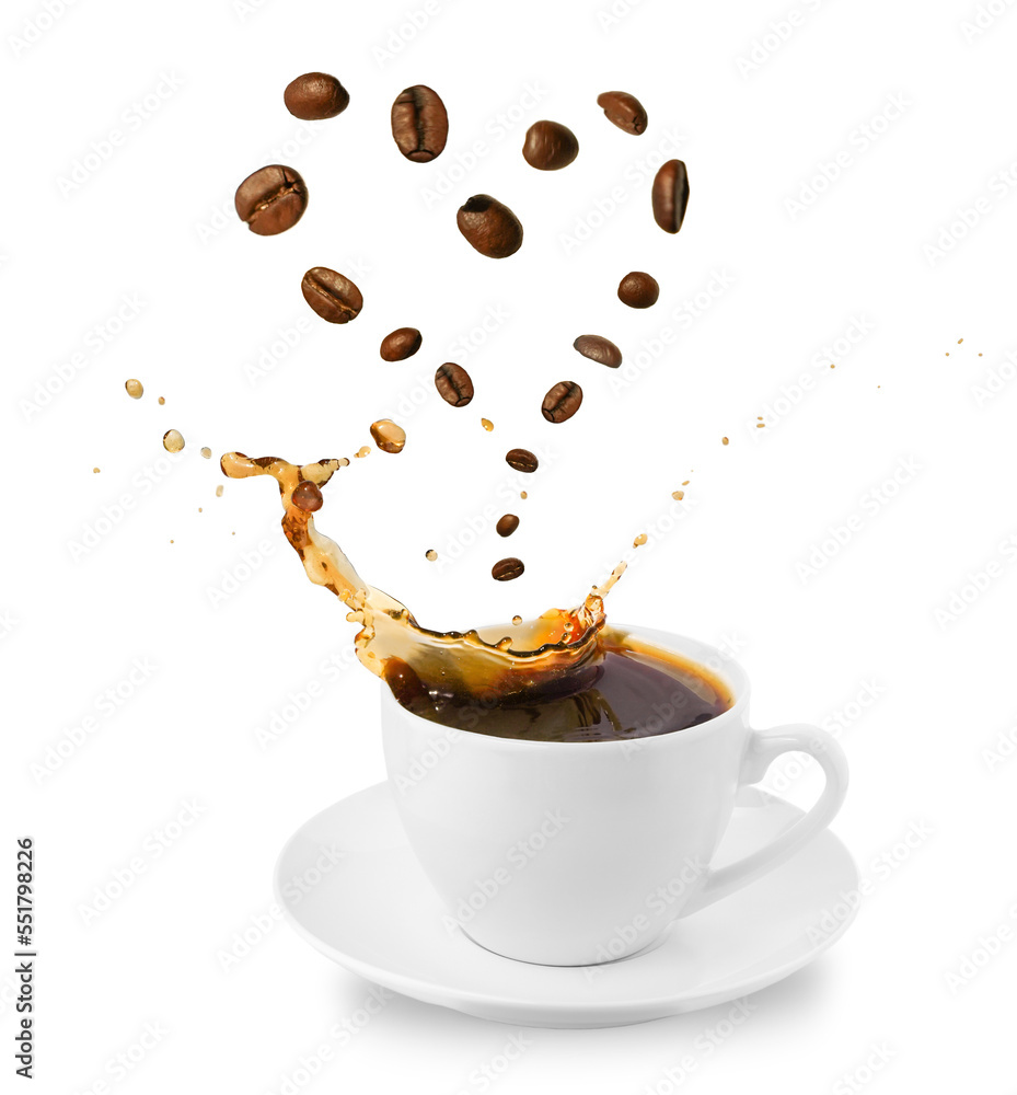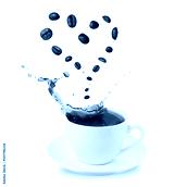 Dynamic splash of espresso with roasted coffee beans forming a heart shape. Isolated. PNG transparent background.