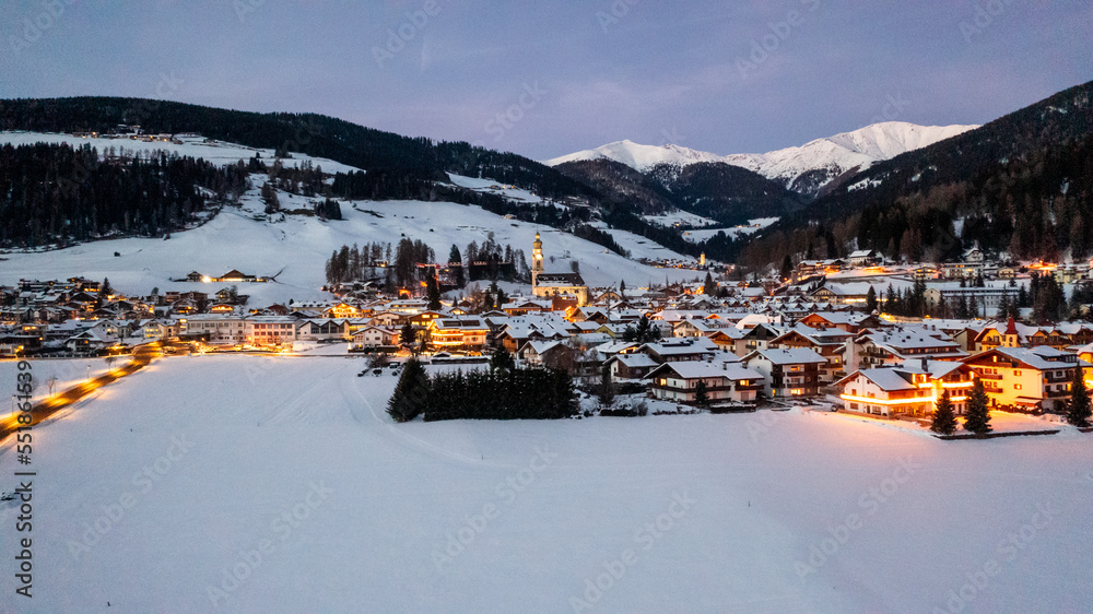 winter landscape, Dobbiaco Toblach, Bolzano, Italy. Aerial drone shot in january, Aerial view of beautiful alpin mountain town, christmas time , city with lights