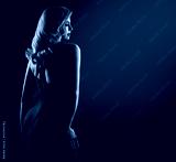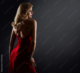 Sexy Blond Hair Woman in Red Dress Back Side view. Beautiful Blonde Girl Silhouette in Backlight. Fashion Model in Red Gown over Black Background. Elegant Lady Face Profile