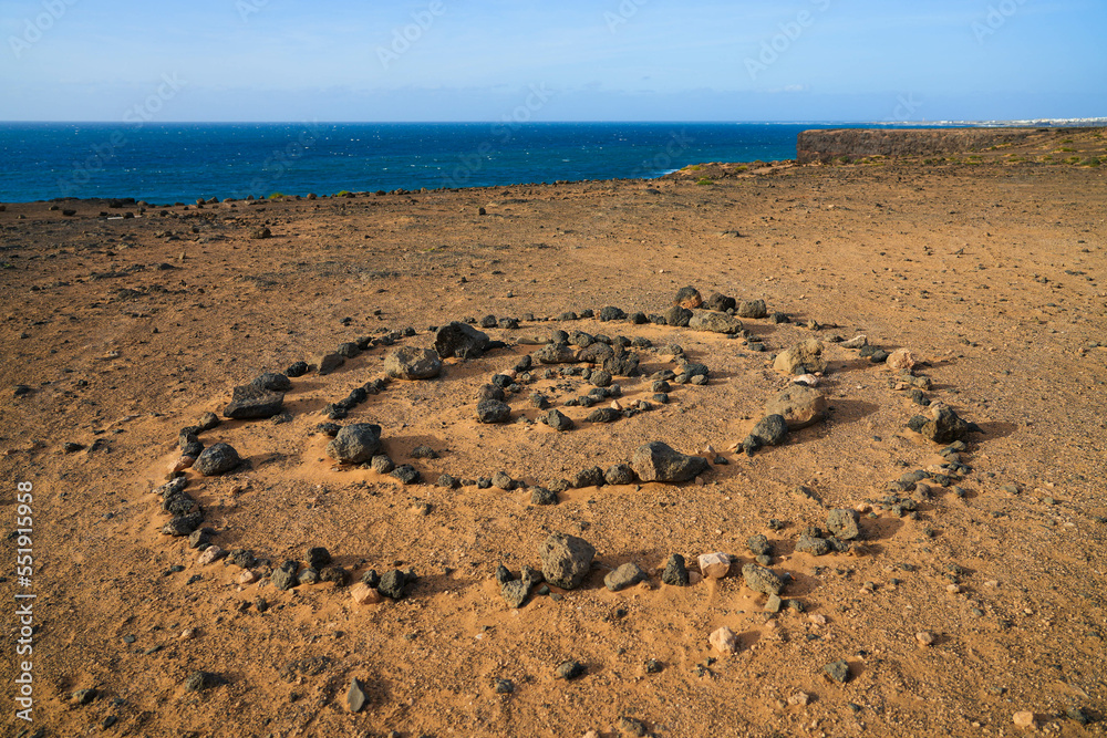 Concentric circles made out of stones in the desert over Playa de la Escalera (Staircase Beach) on the western coast of Fuerteventura in the Canary Islands, Atlantic Ocean, Spain