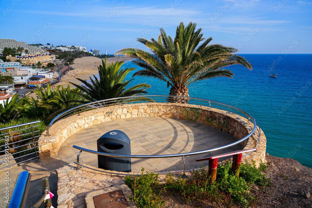 Lookout platform overlooking the Playa del Matorral (Matorral Beach) in the resort town of Morro Jable in the south of Fuerteventura in the Canary Islands, Spain